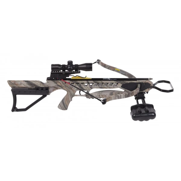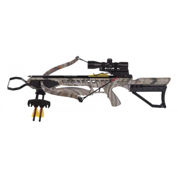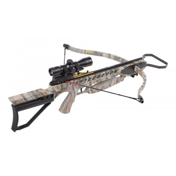 | Accessoires | 3 traits alu 16″, carquois, lunette 4×32, armeur manuel, lubrifiant à rail |