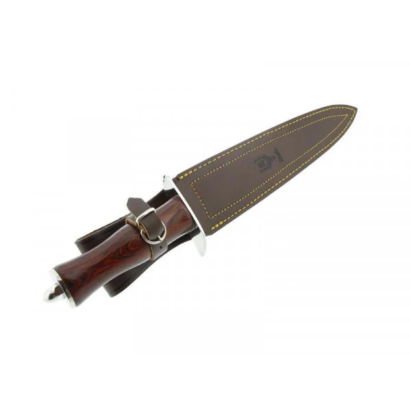 - Dague MUELA « BEAR », lame double tranchant 24 cm acier inox X50CrMoV15, manche stamina, monture inox, étui cuir.
